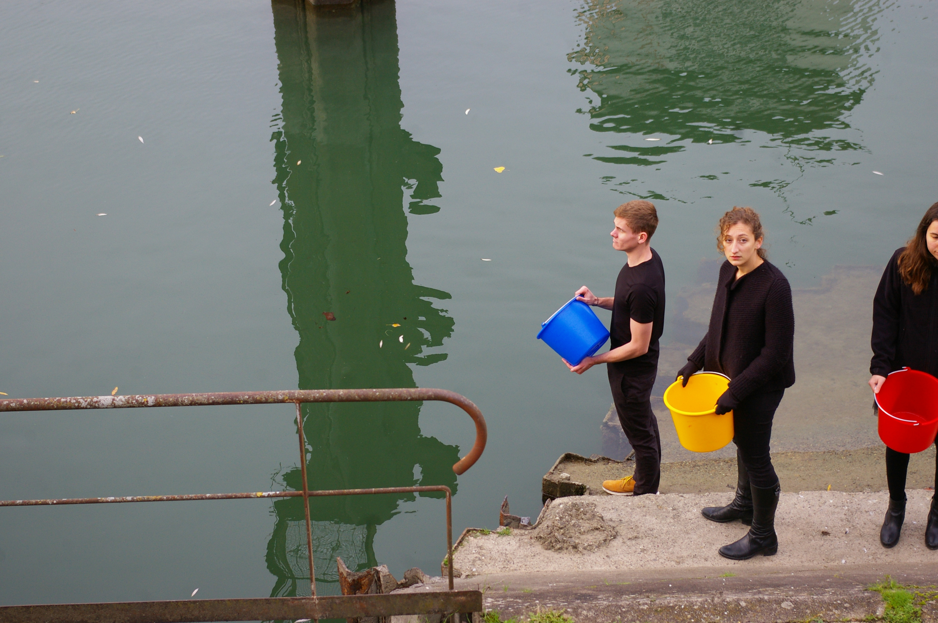 Nous sommes déjà en train d’imaginer la présentation de tous les travaux à l’Aubette 1928. Un des étudiants, Sâm Afchar, se propose de nous filmer : scénario un peu dada, car l’idée est de montrer que dans le port l’accès à l’eau reste un mirage ! Nous avons alors décidé d’amener l’eau dans le port. Nous commençons à puiser l’eau dans un des rares bassins accessibles, nous la passons d’une personne à l’autre, la jetons en l’air pour finir par nous transformer toutes et tous en matière aquatique à notre tour.