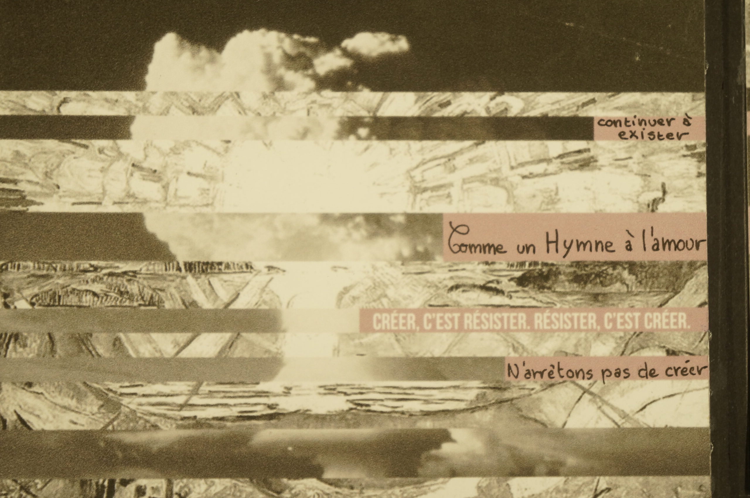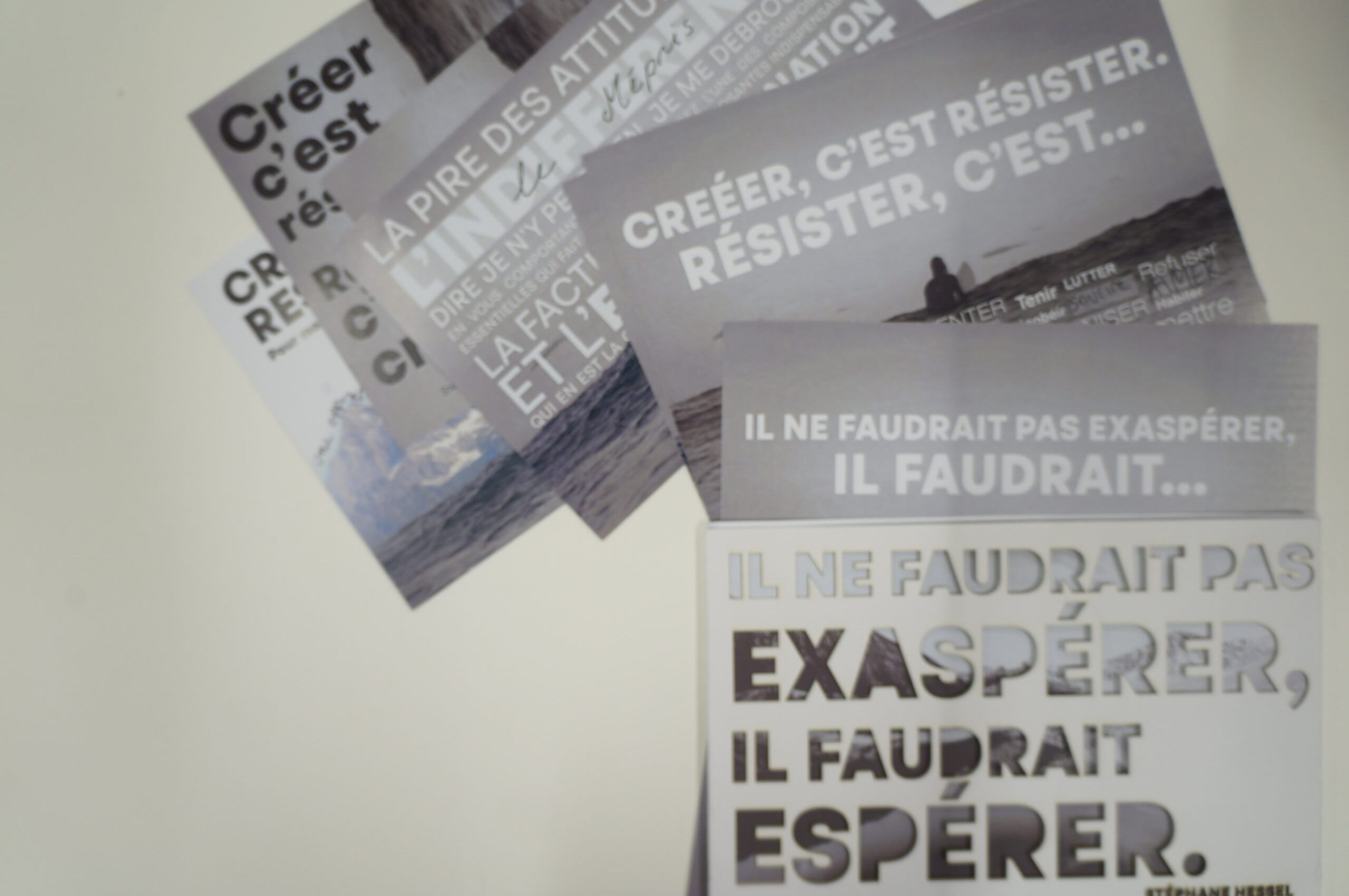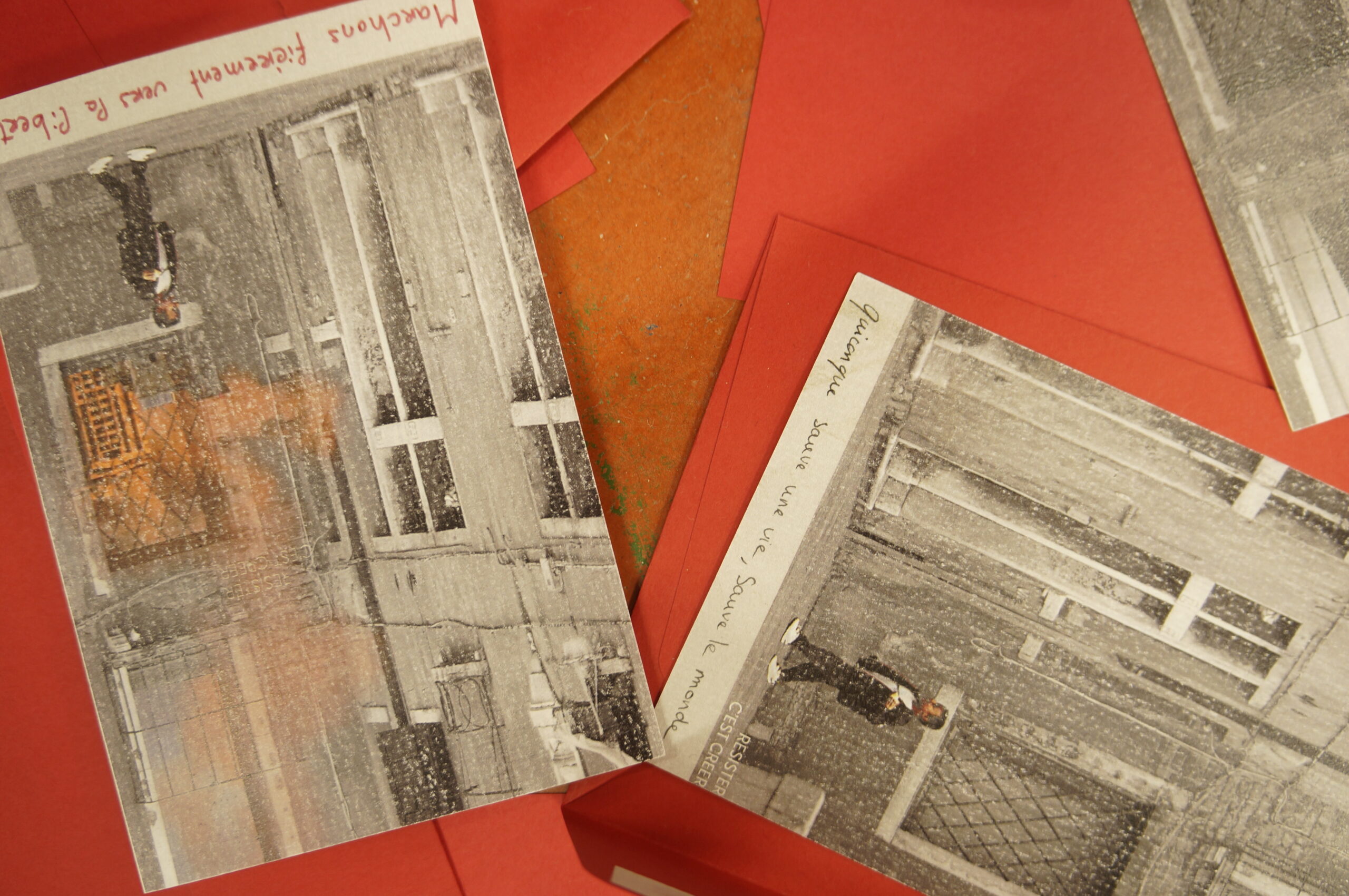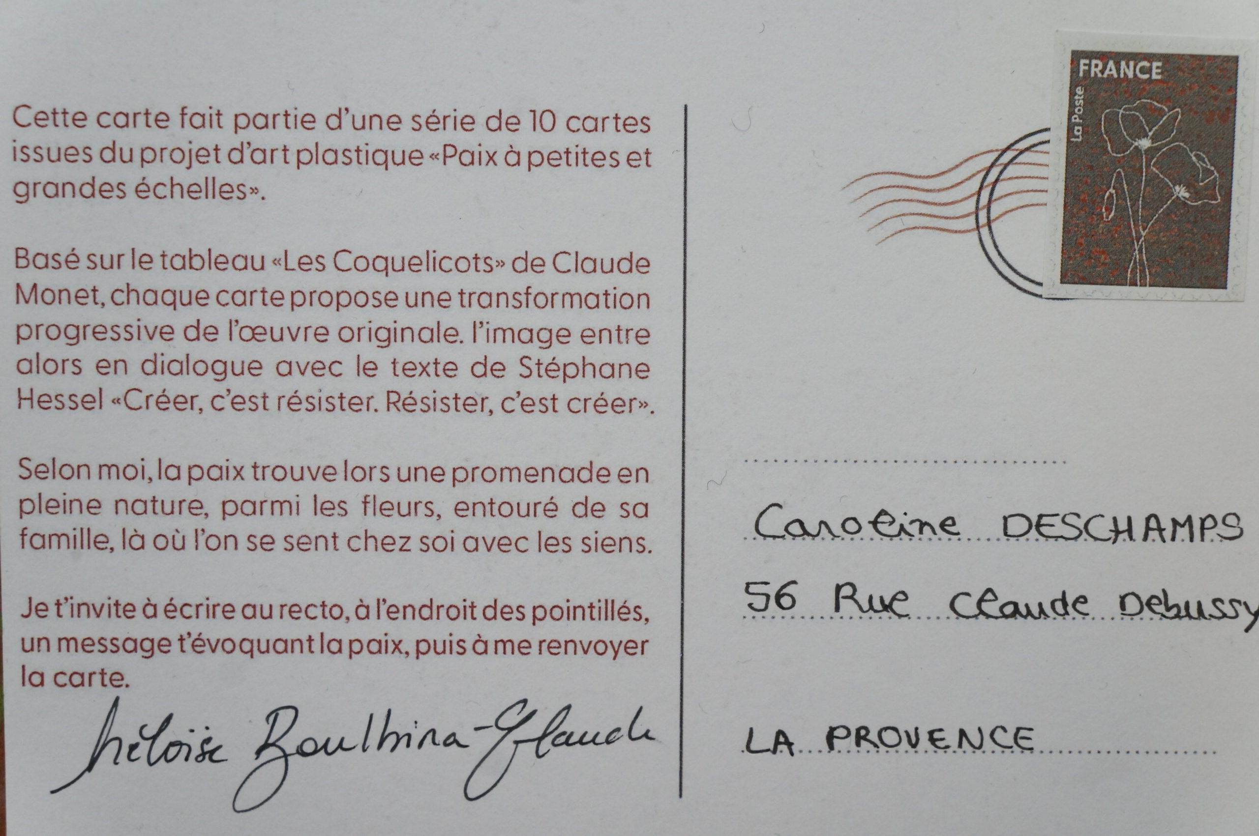 En parallèle, une série de dix cartes postales a été réalisée à partir d’une photographie inspirant la paix. Le texte de Stéphane Hessel « Créer c’est résister, résister c’est créer » y est intégré afin de dialoguer avec l’image. Chaque carte comporte un « blanc » que la personne recevant celle-ci devait compléter pour multiplier ainsi les messages de paix.