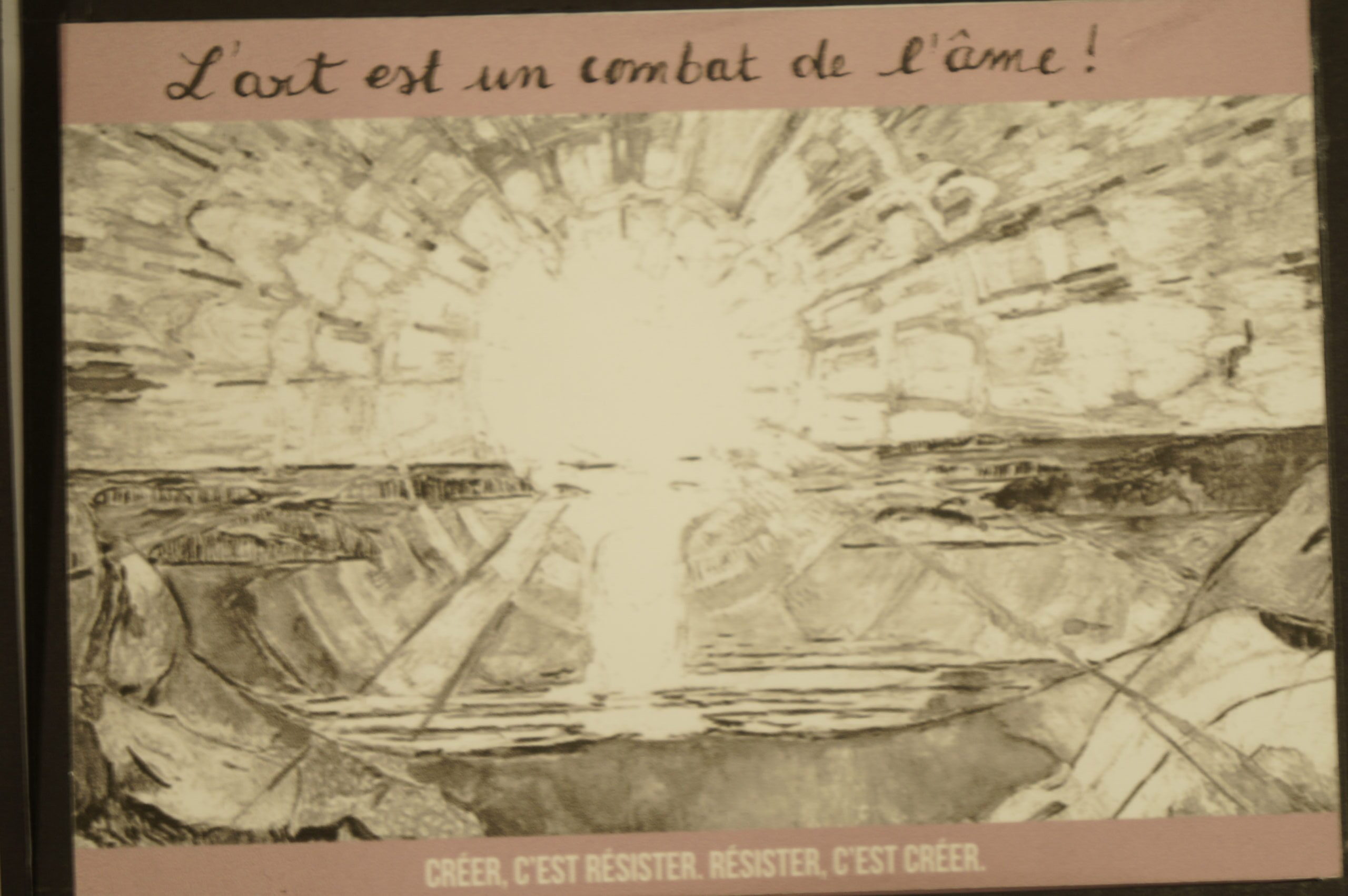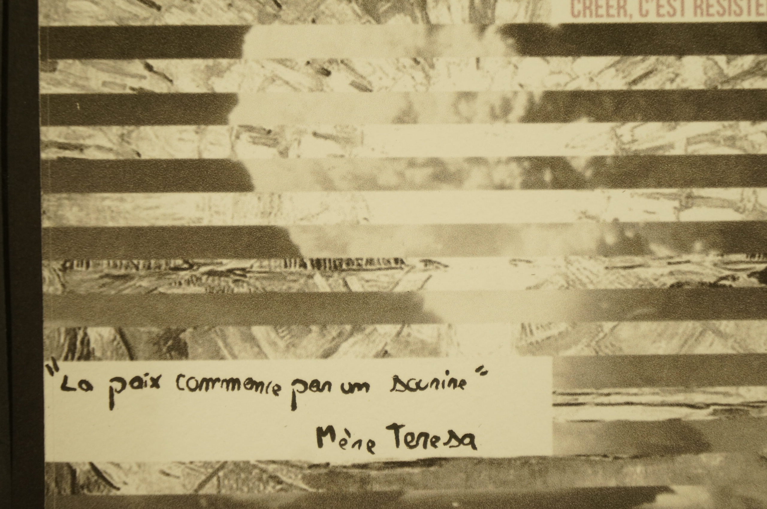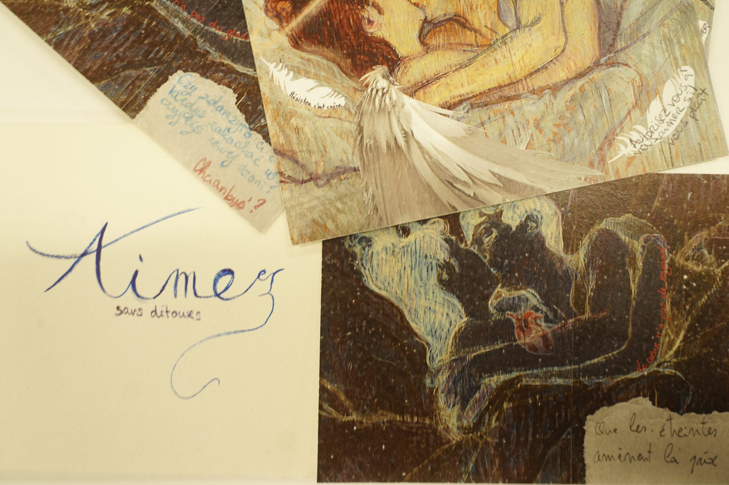 En parallèle, une série de dix cartes postales a été réalisée à partir d’une photographie inspirant la paix. Le texte de Stéphane Hessel « Créer c’est résister, résister c’est créer » y est intégré afin de dialoguer avec l’image. Chaque carte comporte un « blanc » que la personne recevant celle-ci devait compléter pour multiplier ainsi les messages de paix.