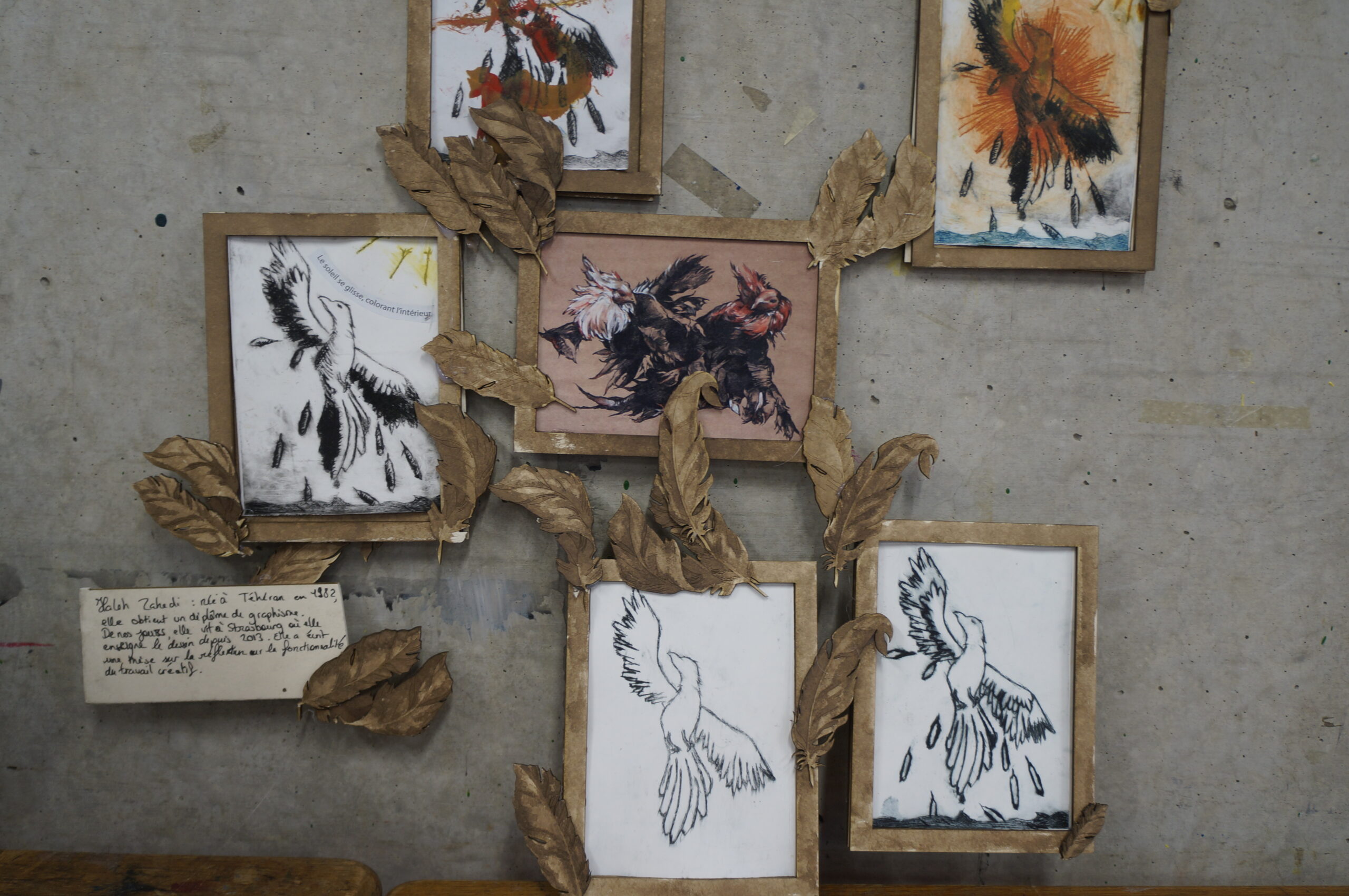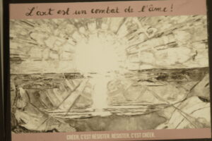 Ensuite, nous sommes allé.e.s à artothèque pour emprunter une oeuvre d’art en rapport avec la paix. Cette oeuvre ainsi que le poème, ont été les sources d’inspiration pour réaliser une série d’estampes à la pointe sèche (technique de gravure de taille directe sans passer pas la morsure à l’acide).